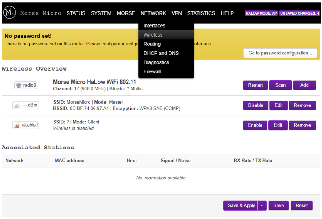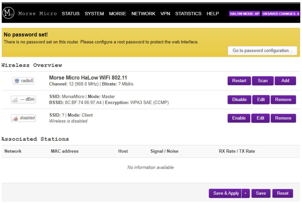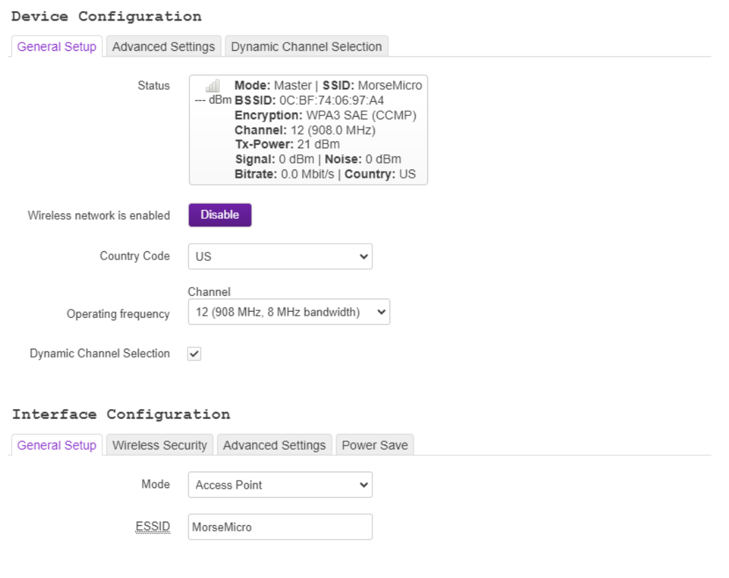 The following configuration is tested using Morse Micro EKH01 firmware version OpenWrt version 2.3.3.