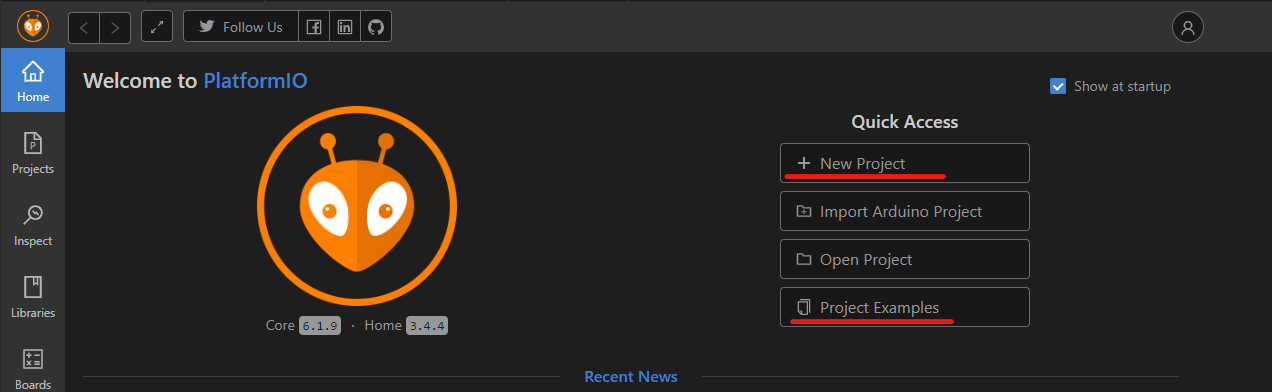 - This should now display the home screen of PlatformIO where you can now start a new project or example (Figure 24).